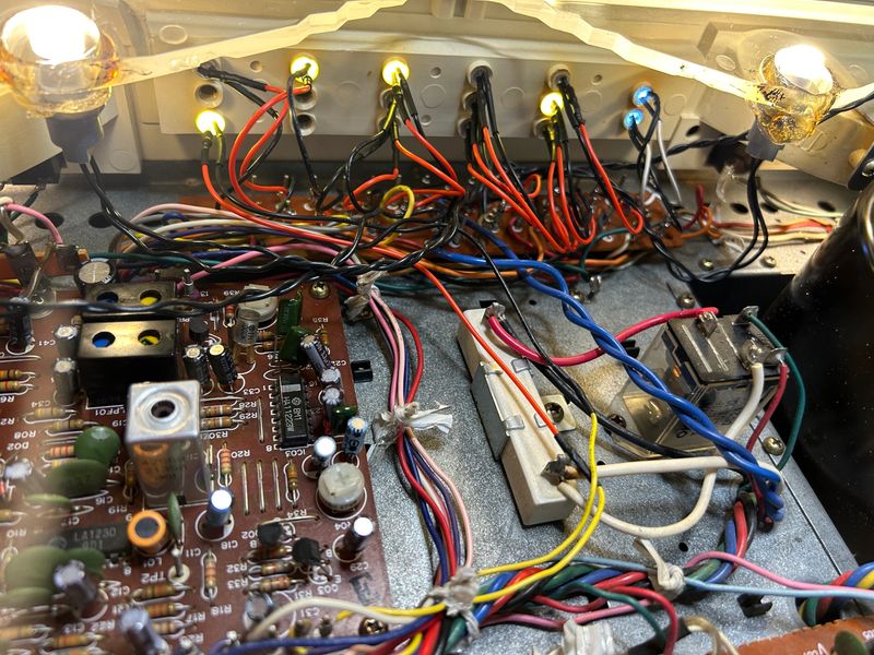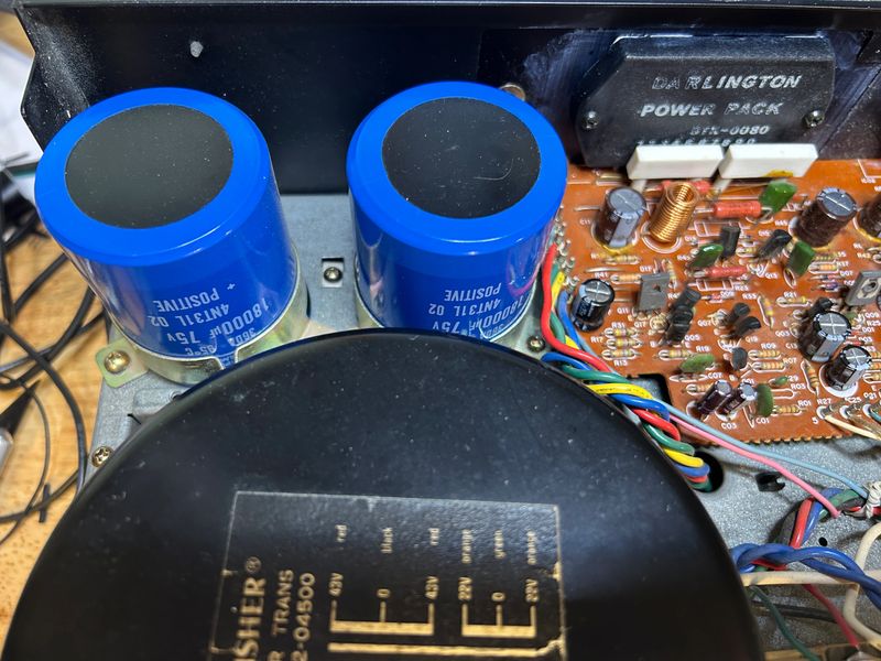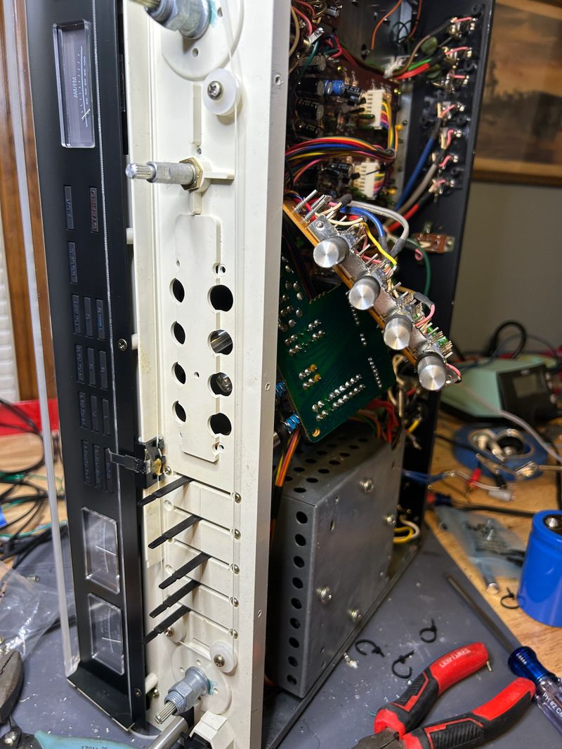 Restoration of a nice Fisher RS-2010 receiver for a friend. Included replacing all eletrolytic capacitors (and some ceramic capacitors), replacing noisy low-level transistors in the phono section, cleaning and lubricating switches and controls, replacing meter movements, replacing lamps with LEDs, and fabricating a custom speaker connection panel. It was a large project but the old girl looks and sounds like new.